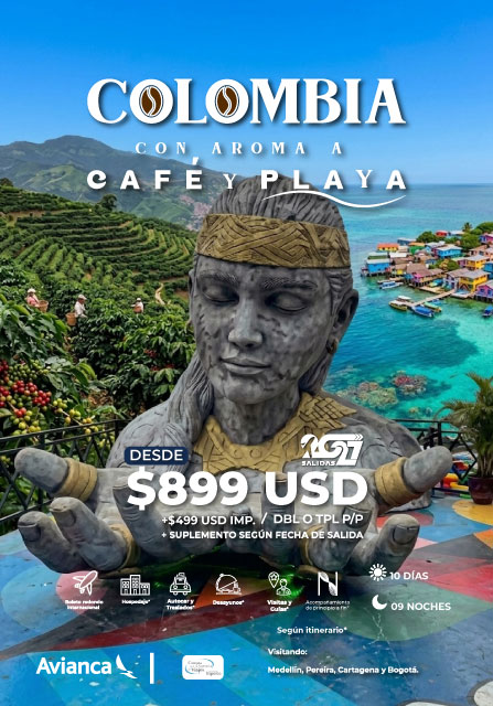 Vive un recorrido que despierta todos los sentidos, combinando la esencia cultural, la tradición cafetera y la magia del Caribe. Inicia en Bogotá, donde la historia y la modernidad se encuentran; continúa en Medellín, una ciudad vibrante e innovadora; y se adentra en Pereira, corazón del Eje Cafetero, donde los paisajes verdes y el aroma del café envuelven cada experiencia. El viaje culmina en Cartagena, joya colonial a orillas del mar Caribe, con playas paradisíacas y atardeceres inolvidables.