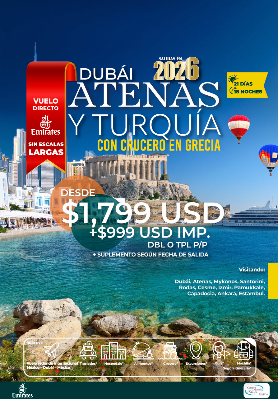 Admira la grandeza futurista de Dubái, recorre los tesoros clásicos de Atenas y déjate cautivar por la magia de Estambul. Completa esta travesía con un espectacular crucero por las islas griegas, donde el mar Egeo y sus encantadores pueblos te regalarán momentos únicos.