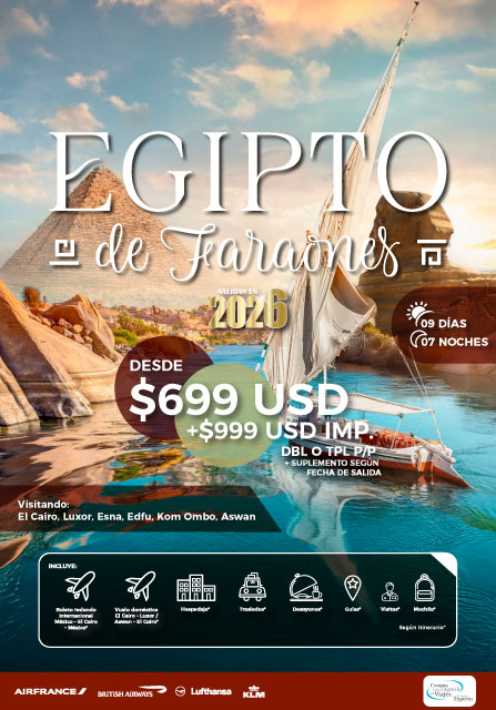 Descubre la grandeza de los faraones con nuestra oferta estelar del año. Desde los majestuosos templos de Luxor y Aswan hasta las icónicas pirámides de Giza, este viaje te sumergirá en el esplendor de la antigua civilización egipcia. Explora la enigmática Esfinge, navega por el Nilo y sumérgete en la atmósfera vibrante de El Cairo. Una oportunidad única para experimentar la magnificencia de Egipto de una manera que nunca olvidarás.