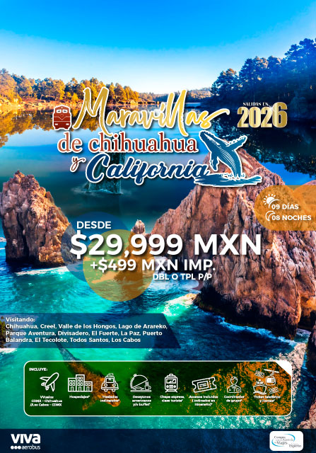 Embárcate en una experiencia única que te llevará desde las imponentes Barrancas del Cobre hasta los paisajes costeros de Baja California. Vive la grandeza de Chihuahua, con su historia minera, pueblos mágicos y la ruta del legendario tren Chepe Express, para después dejarte sorprender por la belleza del Mar de Cortés, los desiertos infinitos y la esencia moderna del norte en Baja California.