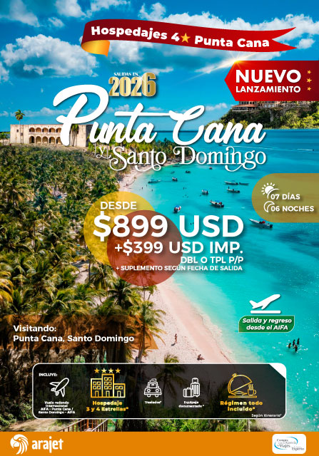 Disfruta el Caribe en todo su esplendor con Punta Cana y Santo Domingo, un viaje que combina relajación, cultura y paisajes paradisíacos. Vive días de sol, mar y arena en las playas de Punta Cana, y descubre la historia y el encanto colonial de Santo Domingo, la primera ciudad del Nuevo Mundo. Una experiencia perfecta para quienes buscan descanso, diversión y un toque de tradición caribeña.
