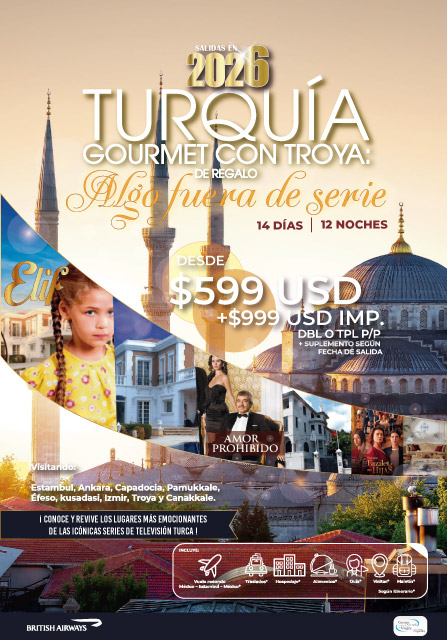 En esta emocionante aventura, nos adentraremos en las calles de Turquía para descubrir las icónicas fachadas que han dado vida a tus novelas turcas favoritas. Desde los imponentes edificios de Estambul hasta las pintorescas casas en la costa del Egeo, vivirás una experiencia que combina lo mejor de la gastronomía turca con la magia histórica de Troya. Sumérgete en los sabores auténticos de Turquía, degustando platos tradicionales en mercados vibrantes y restaurantes selectos. Además, explorarás las legendarias localizaciones de la antigua Troya, donde la historia y la mitología cobran vida. Este viaje es una celebración para los sentidos y una inmersión total en la rica cultura turca, ¡un regalo que nunca olvidarás!